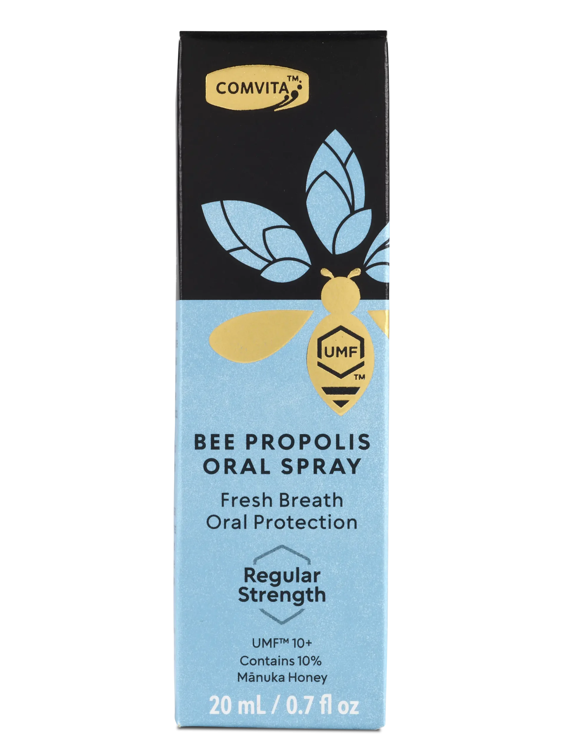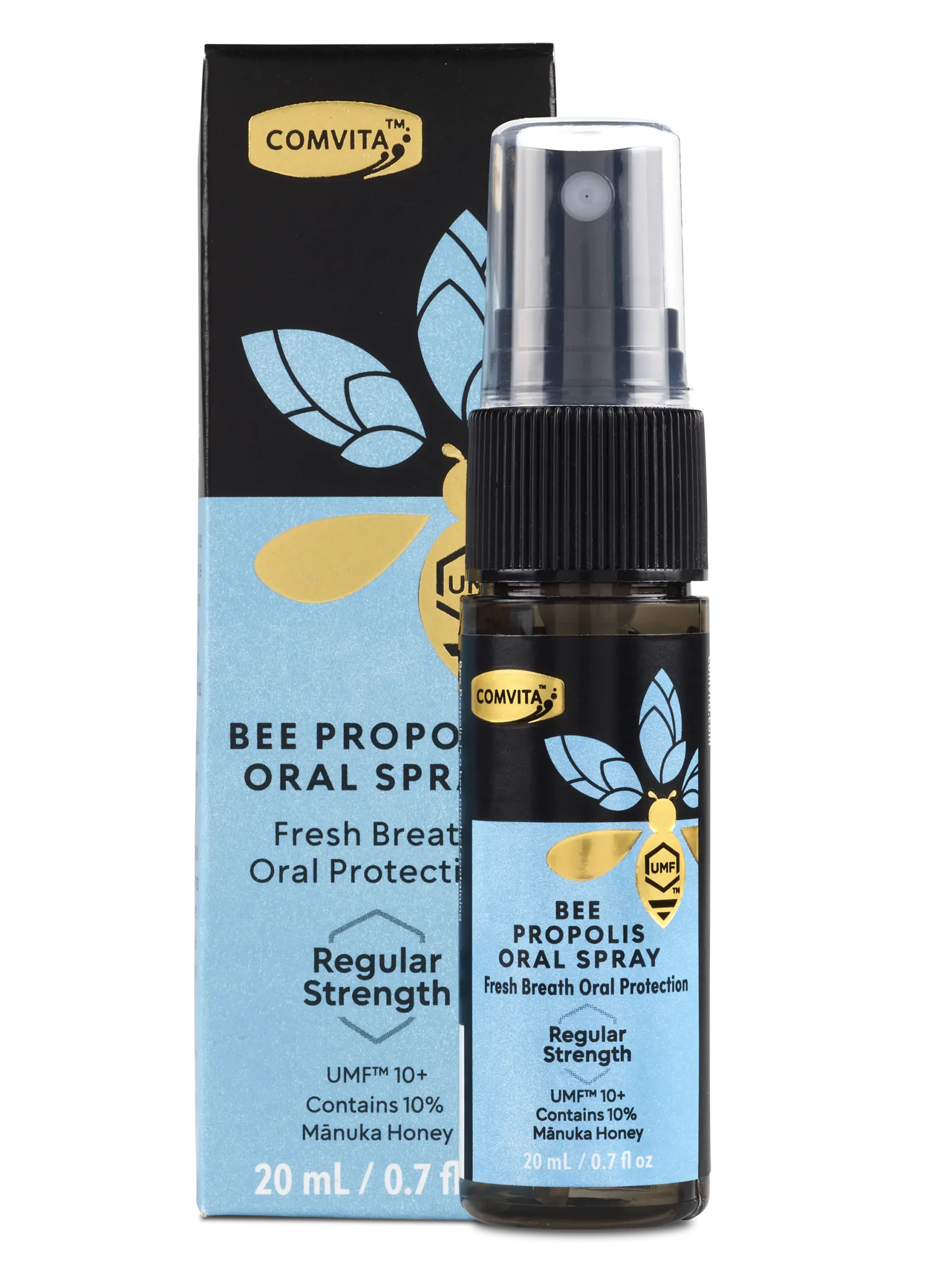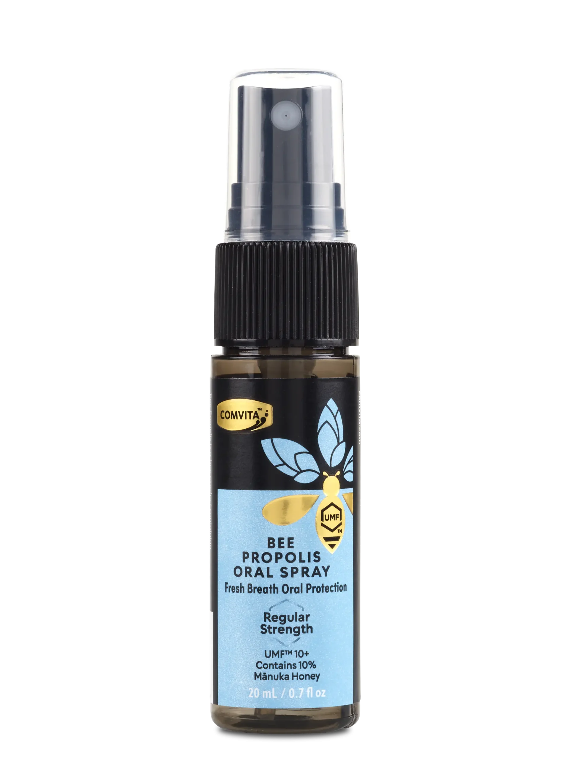 Support your Oral hygiene with Comvita Propolis Oral Spray Regular Strength. A natural, bee propolis Oral spray that helps fight odor causing bacteria, hydrates and freshens the mouth. Contains 10% Mānuka honey (UMF10+) for extra immune boosting antioxidants to strengthen your natural defenses.