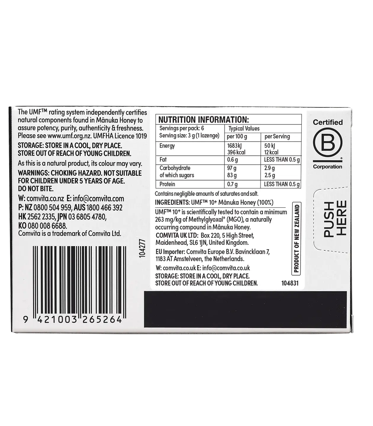Të prodhuara me 100% mjaltë Mānuka nga Comvita, këto karamele janë një burim i shkëlqyer natyral energjie përpara ose pas stërvitjes, apo kur jeni në lëvizje. Ato janë gjithashtu ideale si një zgjidhje natyrale për qetësimin e fytit që dhemb.